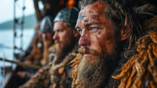 Viking sailors in traditional clothing sail on a wooden ship off the rocky coast