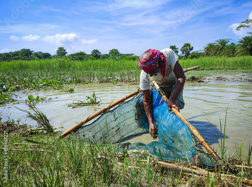 Village fisherman fishing with a lave net in hand from a lake, rural old man is working beside a river, Bangladeshi fisherman with white dress and towel in head
