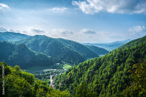 Village surrounded by forested mountains with blue sky in Romania, Eastern Europe. Concept of travel, escape society, nature relaxing, remote places, traditional landscape. Carpathian Mountains.