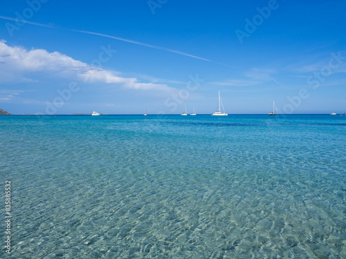 Villasimus, Sardegna. The wonderful bay of Porto Giunco. Sea in shades of turquoise blue. Tourist destination. Sea of Sardinia one of the most beautiful in Italy. Boats off the coast