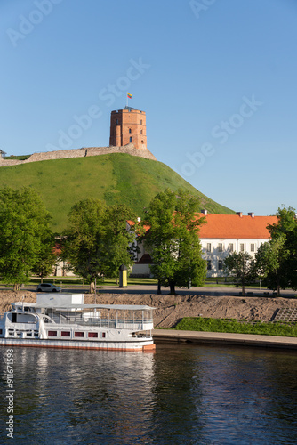 architecture, boat, canal, capital, castle, city landscape, copy space, famous, ferry, fortress, green, landmark, landscape, lithuania, outdoors, river, ship, sky, spring, summer, tower, transportation, urban, vilnius, water, watercraft, waterfront