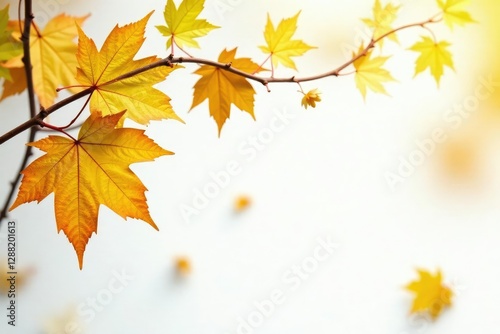 Vines of golden yellow maple leaves entwined with green autumn foliage on a crisp white background, white, autumn, nature