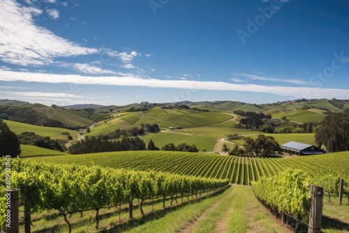 vineyard surrounded by rolling hills, with picturesque farms and blue skies in the distance, created with generative ai
