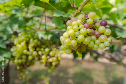Vineyard with white wine grapes in countryside, Sunny bunches of grape hang on the vine