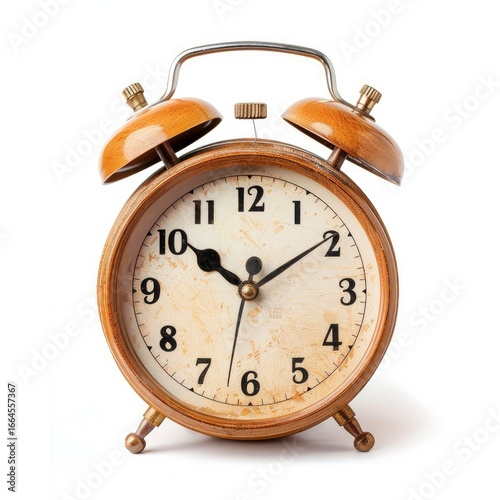 Vintage alarm clock, light brown wooden casing, showing a specific time, isolated on white background