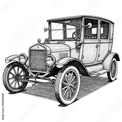 vintage car, classic car, old-timer, vignetting, line art, illustration, drawing, transportation, engraving, black-and-white, 1920s, history, nostalgia, carriage, motorized, mechanical, hand-drawn, isolated, historic, doodle, art, design, old-fashioned, collectable
