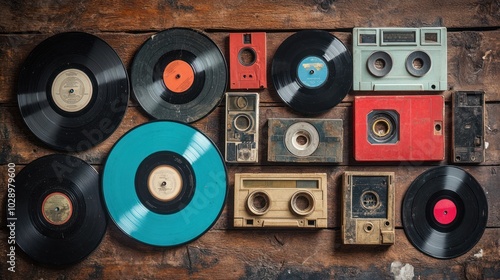 record, vinyl, audio, cassette, tape, music, player, format, old, antique, vintage, retro, classic, technology, analog, digital, wooden, background, wall, brown, black, blue, red, white, grey, dusty, worn, scratched, round, square, rectangle, center, edge, side, top, bottom, collection