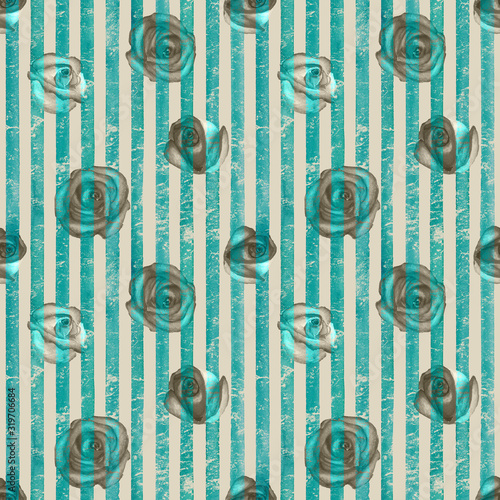Vintage background with watercolor roses on teal turquoise stripes seamless pattern