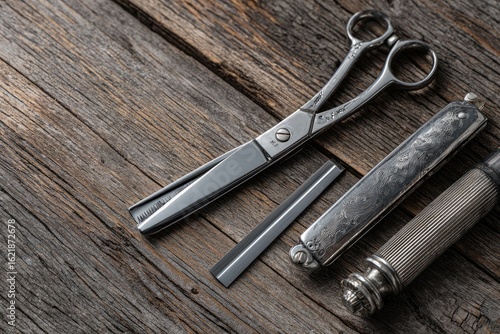 Vintage barber tools on weathered wooden planks. Sharp shears, a straight razor, and a vintage hair clipper rest on a rustic wood surface