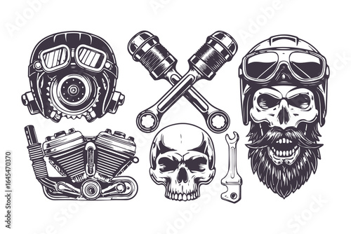 Vintage Biker and Motorcycle Emblem Set. Vector Illustrations of Skull, Engine, and Pistons in a Tattoo Style