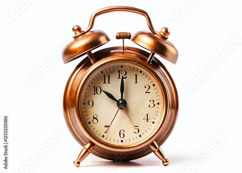 Vintage Bronze Alarm Clock Showing Seven AM, Isolated on White Background with Arrows Pointing Left, Copy Space