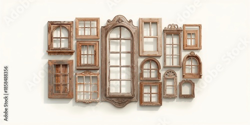 Vintage brown window frames in different shapes serving as a backdrop for design elements