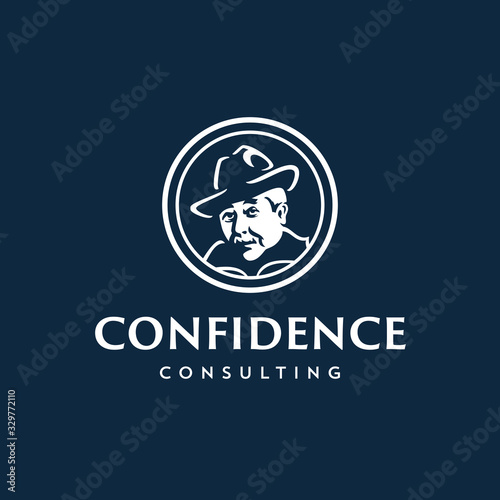 logotype, confidence, face, template, retro, badge, label, signs, symbol, shield, crest, emblem, woodcut, brand, frame, branding, identity, typography, rubber, stamp, icon, seal, patch, consulting, design, corporate, style, graphic, background, illustration, vector, company, hipster, avatar, old, man, male, human, head, grandfather, grandfather, hat, wisdom, life events, trust, business, vintage, american