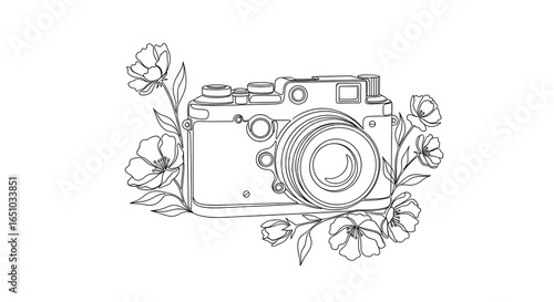 Vintage Camera with Floral Elements – Line Art Illustration of Classic Photography Gear Surrounded by Roses and Leaves