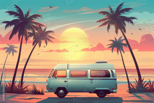 Vintage camper van enjoying tropical sunset on beach, embracing wanderlust and freedom