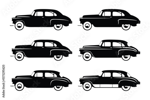 Vintage Car Vector Set: Six classic silhouette cars showcase automotive design, perfect for retro and transportation themed projects.