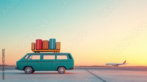 vans, baggage, sunset, runway, aeroplane, travel, road trip, adventure, journey, horizon, vacation, retro, transport, outdoors, vehicle, scenic, peaceful, bright, colours, holiday, summer, design, lifestyle, leisure, freedom, exploration, tour tourism, nature, sky, trendy, vintage, urban, environment, picturesque, wanderlust, transportation, minimalist, empty space, scenic view, relaxing, fun