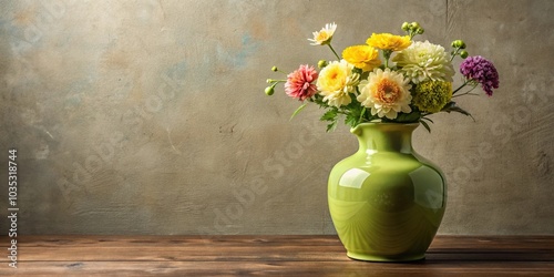 Vintage chartreuse ceramic vase with fresh flowers, vintage, floral arrangement, decorative item