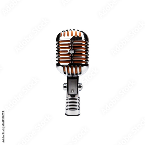 Vintage chrome microphone with brown mesh on elegant stand for broadcasting isolated on white background