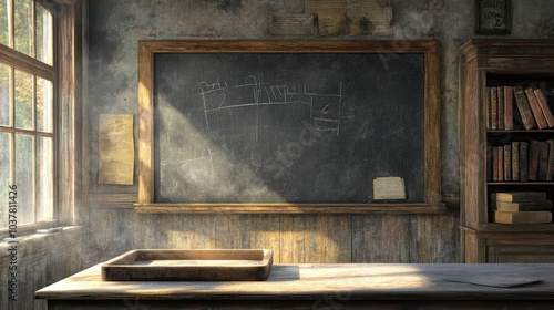 classroom, blackboard, book, sunlight, window, interior, education, learning, school, rustic, texture, empty, untidy, retro, shadow, vintage, stationery, writing, art, space, design, room, workspace, nostalgia, old, surface, brightness, creativity, study, organisation, decor, atmosphere, faded, message, board, simplicity, calm, quiet, warm, environment, unoccupied, history, background, scene, familiar, homely