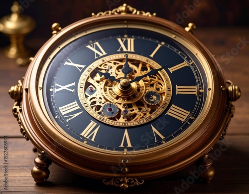 Vintage clock with roman numbers on wooden background