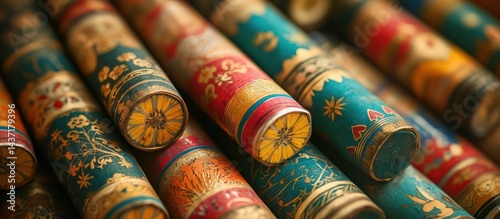 cylinder, decorative, vintage, closeup, pattern, ornate, colourful, design, antique, wallpaper, collection, texture, historical, craft, detail, object, paper, history, scroll, craftsmanship, intricate, display, art, background, retro, detail, ornamental
