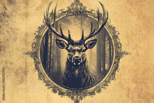 Vintage Deer Portrait with Ornate Frame and Forest Background