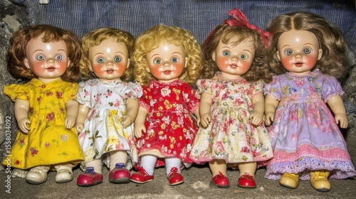 Vintage Doll Ensemble: Five Antique Dolls in Colorful Dresses, Nostalgia.