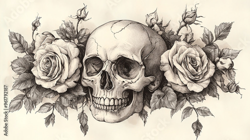 vintage, engraved, skull, rose, monochrome, retro, style, classic, design, black, white, traditional, art, antique, aesthetic, illustration, engraving, elegant, detailed, floral, timeless, skeleton, decoration, visual, ornamental, artistic