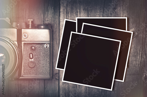 Vintage film camera detail with blank photo frames on wooden table. Top view.