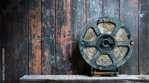 Vintage Film Reel on Wooden Background Against Rustic Wall