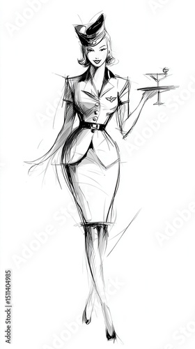 woman, flight attendant, uniform, vintage, illustration, drawing, art, fashion, style, figure, pose, cocktail, tray, ink, line art, graphic, vignetting, design, retro, service, professional, beautiful, elegant, model, lady, walking, modern, portrait, monochrome, black-and-white, copy space, isolated, fine art