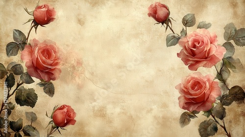 Vintage floral background with pink roses and green leaves on an aged textured surface