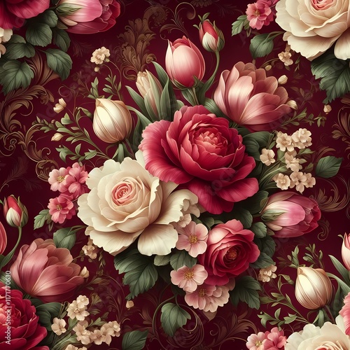 floral, vintage, rose, pink, red, flower, burgundy, pattern, design, ornate, elegant, botanical, nature, wallpaper, textile, blossom, leaf, decorative, gold, antique, classic, romantic, luxury, seamless, blooming, detailed, intricate, foliage, pastel, aesthetic, retro, traditional, victorian, art, decor, bouquet, style, background, illustration