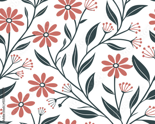 Vintage Folk Art Daisy Seamless Pattern - Abstract Meadow Flowers with Leaves & Stems, Flat Botanical Vector Background