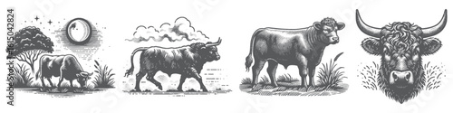 cattle, cow, farm animal, animal, mammal, horn, pasture, farm, rural, nature, field, grass, graze, countryside, landscape, sunset, dusk, sky, warm, light, gold, peaceful, calm, evening, silhouette, horizon, scenic, tranquil, slow, lifestyle, natural, expressive, character, mascot, cartoon, humor, logotype, design, vector, icon, signs, symbol, illustration, creative, printing, engrave, collection, set