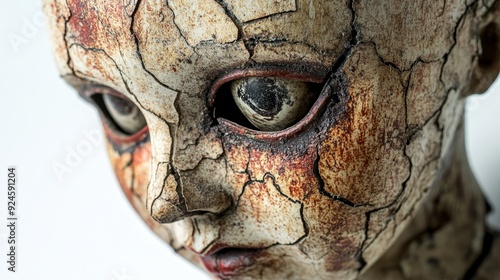 Vintage haunted doll with cracked skin, eerie Halloween mask, spooky and unsettling vibe, isolated on white background