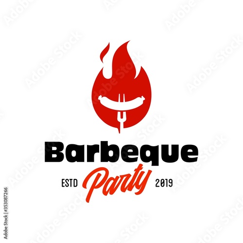 Vintage hipster Grill Barbeque sausage party invitation barbecue bbq with fork and fire flame icon Logo badge design