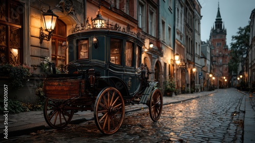 Vintage Horse-Drawn Carriage on Cobblestone Street at Dusk