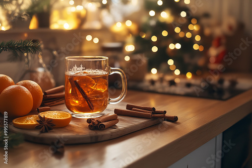 Vintage Kitchen Preparing Warm Christmas Cider with Festive Decor