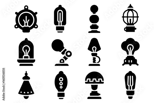 silhouette, vintage, retro, lamp, bulb, icon, classic, design, black, white, lighting, illustration, antique, style, decor, electric, collection, concept, symbol, emblem, filament, shape, home, fixture, nostalgia, energy, interior, signs, graphic, creativity, imagination, old-fashioned, artistic, element, simple, elegant, versatile, uniform, set