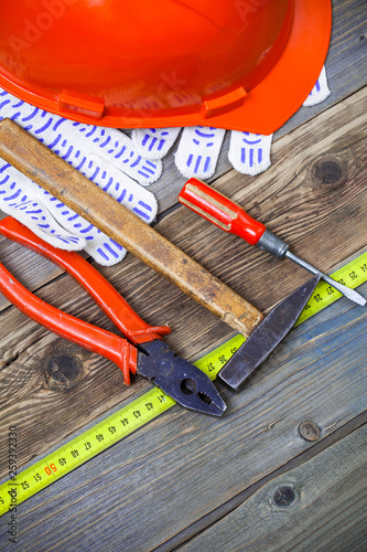 tool, vintage, hammer, plier, screwdriver, tape measure, bright, safety, helmet, glove, old, wooden, surface, metal, plastic, still life, aged, retro, repair, construction, tape, ribbon, measurement, object, texture, textured, nobody, craftsmanship