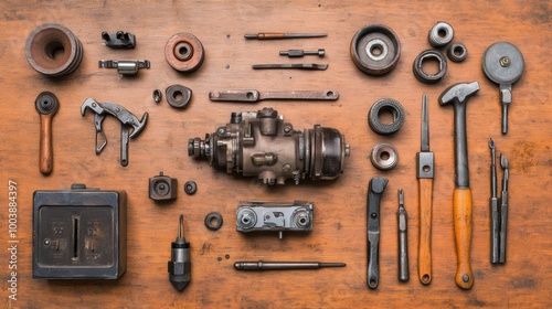 Vintage Mechanical Workshop Tools and Parts Arrangement