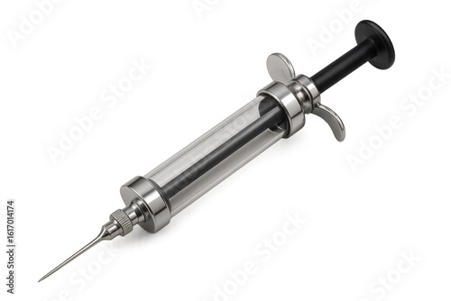 Vintage medical syringe displaying transparent glass barrel, metallic plunger, emphasizing precision engineering for clinical environments