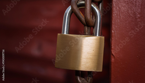 Vintage metal padlock hanging from chain against dark red backdrop. Security and protection concept