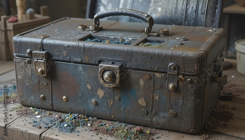 vintage, toolbox, metal, old, antique, worn, weathered, rust, patina, rustic, hardware, handle, latch, storage, container, workshop, garage, craftsman, industrial, retro, aged, grimy, hard-wearing, heavy duty, equipment, collection, display, background, texture