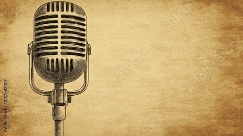 Vintage microphone illustration on aged paper background, perfect for podcasts, radio shows, or music.