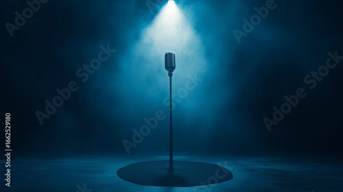 microphone, stage, spotlight, smoky, dark, blue, retro, vintage, music, performance, concert, show, live, sound, audio, speaker, event, lighting, darkroom, theatre, studio, recording, artist, singer, dj, celebration, celebratory, atmosphere, background, empty, black, grey, metal, light, beam, illumination, presentation, dais, vocal, commentary, announcement, broadcast, news, talk, lecture, entertainment