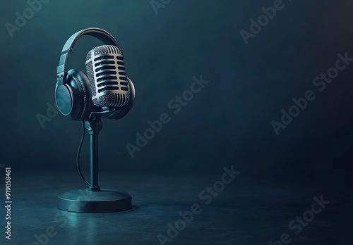 vintage, microphone, earphones, racked, isolated, dark, background, banner, design, podcast, radio, studio, retro, sound, equipment, concept, copy, space, style, antique, audio, recording, communication, classic, broadcast, elegant, professional, iconic, nostalgic, performance, music, talk, technology, sleek, presentation