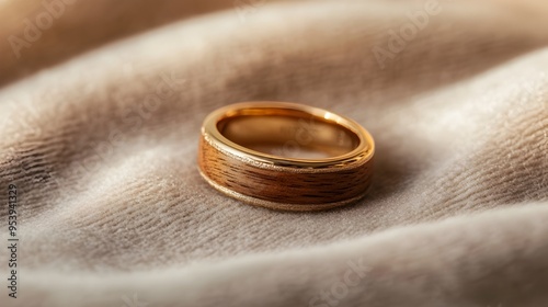 Vintage oak wood ring with a simple yet classic design encased in a gleaming gold band placed on a soft velvet backdrop highlighting its rustic charm and elegant appeal